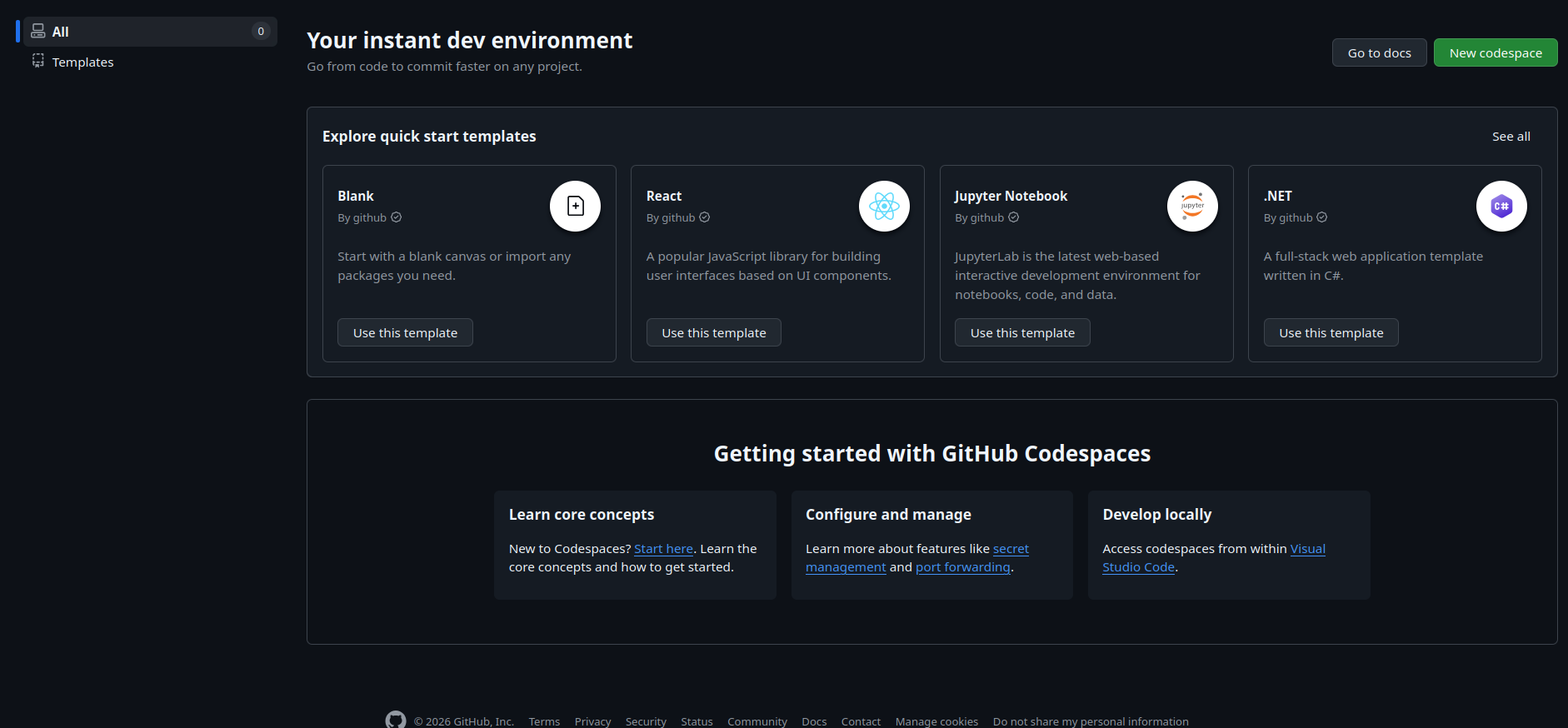 Aby utworzyć swój projekt na zdalnym środowisku, po prostu wchodzimy na stronę codespaces.
