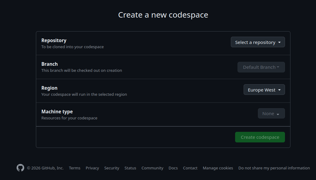 - Uzupełniamy konfigurację środowiska. Tutaj wybieramy z którego repozytorium tworzymy nasz space, branch na którym będziemy pracować (to da się zmienić w trakcie pracy) i parametry komputera który będzie obsługiwał nasz projekt.
